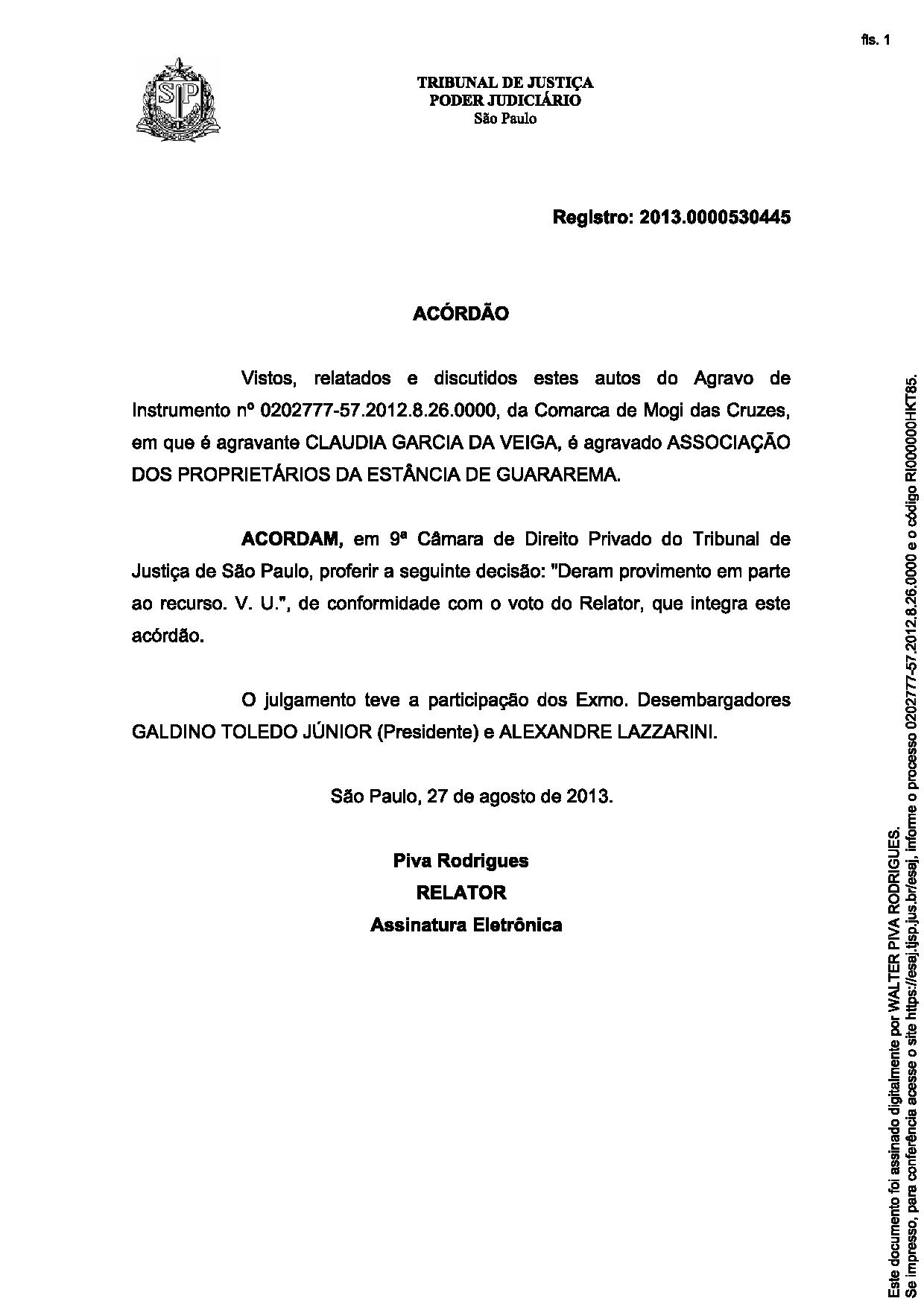 Processo 0013677-16.2013.8.26.0011 - Cumprimento de sentença - ...................................Trata-se de impugnação à execução de sentença judicial. A sentença de mérito de fls. 389/396 condenou os réus (impugnantes) ao pagamento das contribuições da associação autora desde 20.10.2000 até o trânsito em julgado. O acórdão de fls. 502/511 confirmou a sentença. ...................... Colho da Constituição Federal que ninguém está compelido a fazer ou a deixar de fazer alguma coisa senão em virtude de lei. ................................Portanto, ACOLHO a impugnação de fls. 548/562 que ...................interpuseram contra ASSOCIAÇÃO DOS PROPRIETÁRIOS DO RESICENDIAL PARQUE DOS PRÍNCIPES e, declarando a inexigibilidade do título judicial com fundamento no art. 475-L, § 1º, do CPC, determino a interrupção dos atos de execução nesta ação judicial em relação à dívida principal. ........................Int. - ADV: ROBERTO MAFULDE (OAB 54892/SP), VERA CRISTINA TAVARES SANTOS (OAB 322069/SP), FABIO ADRIANO VITULI DA SILVA (OAB 94790/SP)