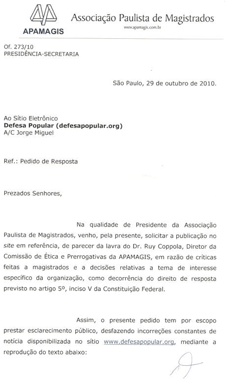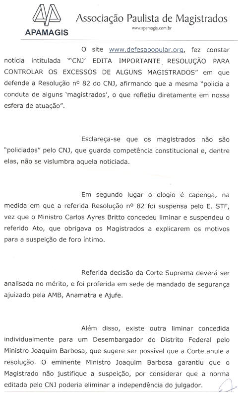 Esclarecemos aos leitores, que a Defesa Popular pela edição de suas reportagens e Matérias publicadas neste site que é voltado para as questões que envolvem os Falsos Condomínios, bem como direcionadas aos leitores, autoridades e assistidos; Tais reportagens culminaram por sensibilizar a Associação Paulista de Magistrados, que requereu o Direito de Resposta com seu pedido de lavra do Dr. Ruy Coppola e Presidente o Dr. Paulo Dimas de Bellis Mascaretti, sendo certo que após detida leitura por nosso Diretor Jurídico, assentiu em publicar por entender se tratar de Direito: