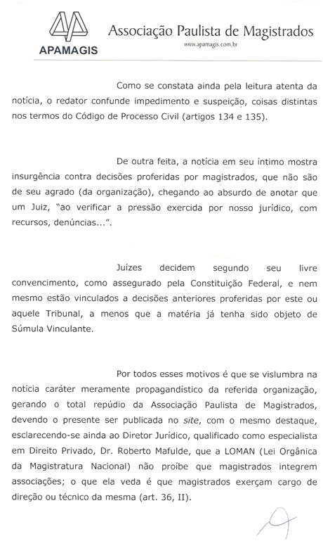Porém, mais objetivamente, as matérias visam o entendimento dos leigos e vítimas, o que pode trazer aos mais letrados e especialistas, algumas interpretações dúbias. Entretanto, no que tange às Matérias apresentadas e discriminadas no Pedido de Direito de Resposta, temos a observar apenas que a Lei Orgânica da Magistratura Nacional, não prevê legalidade ao Magistrado, em participar efetivamente de cargos em Associações Civis ao contrário VEDA.