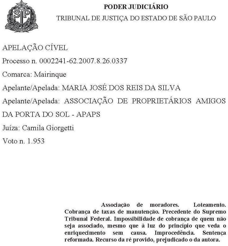 Nota do Editor: Congratulamos a Eg. 9ª Câmara de Direito Privado do Eg. Tribunal de Justiça do Estado de São Paulo que reverteu absurda decisão monocrática do Juzo de Mairinque, aliás, reiteradas decisões idênticas deste Foro onde estranhavelmente a magistrada quando apreciou a primeira defesa de um morador, condenou a Associação (Porta do Sol), porém, depois, passou a dar ganho de causa parcial mas agora viu sua decisão revertida pelo TJSP