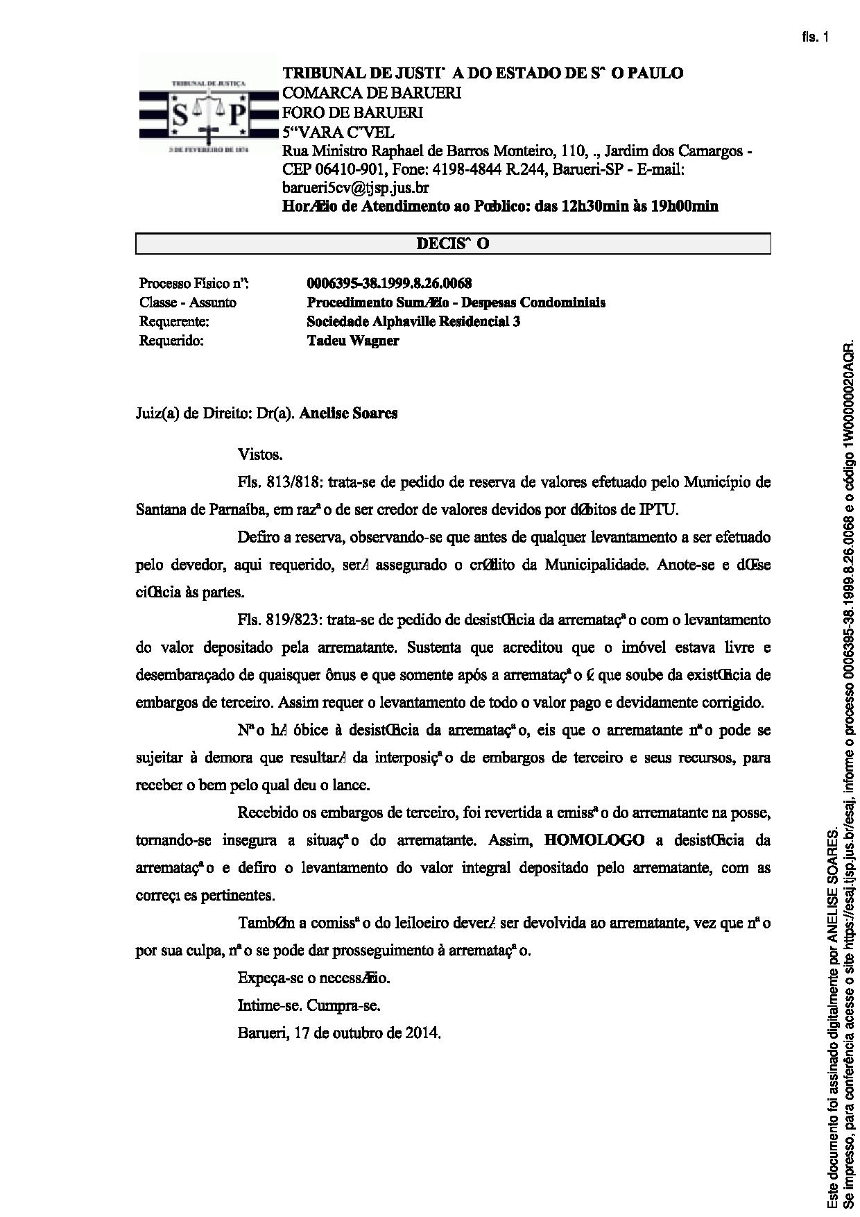 Apenas como referência do que aconteceu para que os leitores tomem ciência da gravidade e do absolutismo do poder paralelo existente nestas questões dos "falsos condomínios", ainda por ser o processo público e não estarmos ferindo a ética ou desacatando qualquer tipo de autoridade mas sim reportando fatos, passaremos a demonstrar o Ordem do TJSP que mandou o juiz anular os atos processuais após a entrada do jurídico, e reintegrar o morador na posse. Determinando e proibindo que o arrematante retirasse o dinheiro com emissão imediata das vítimas na posse do imóvel como mandou o Tribunal.