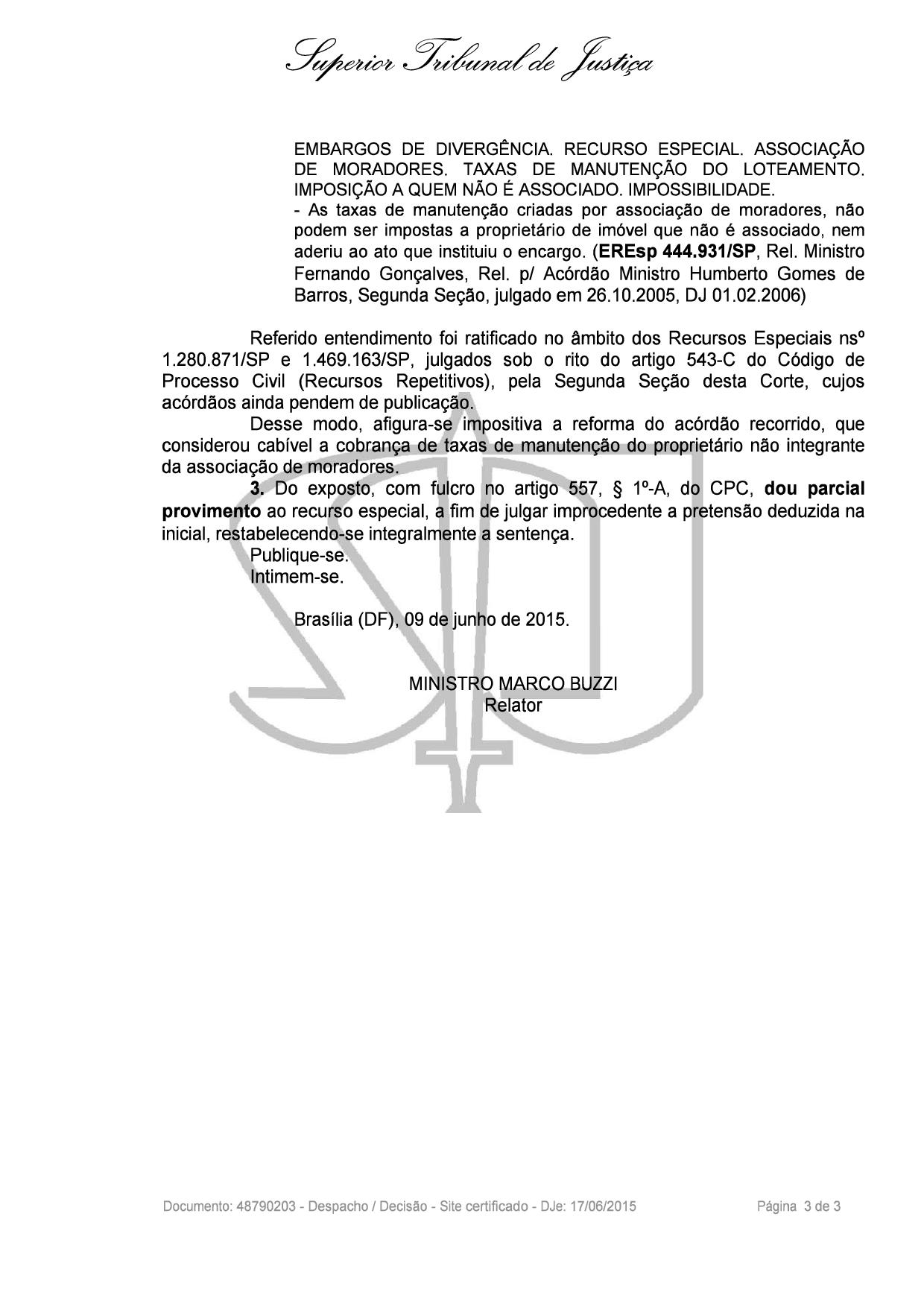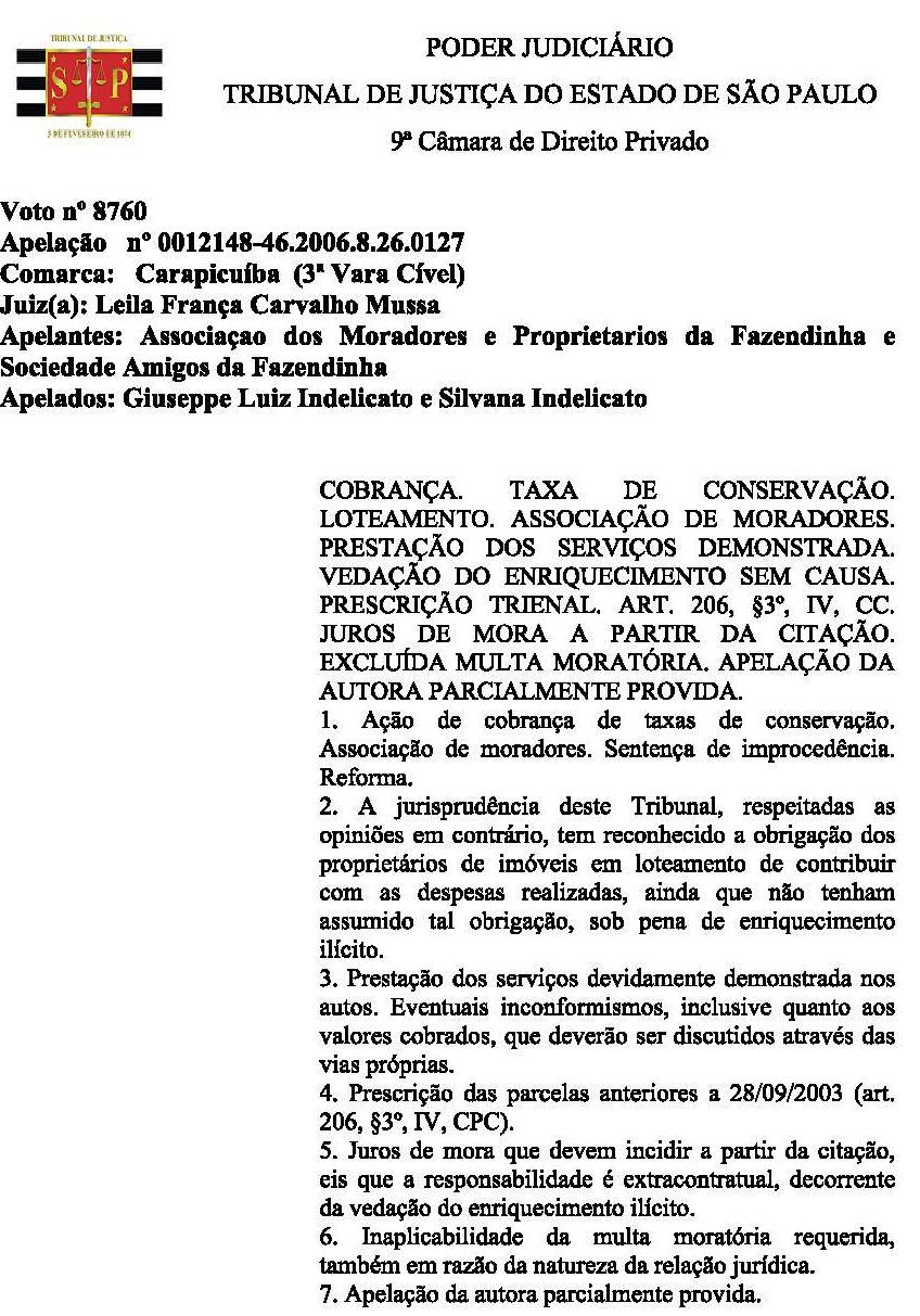 A seguir a reforma da decisão em mais esta vitória contra a associação que estava acostumada a fazer fortunas com a venda em face da penhora dos imóveis dos moradores que não concordavam em se submeter à esta fraude. Assim intimidando os moradores que ganhava todas as ações na Justiça. Mas o STJ graças à combatividade de nossa equipe jurídica, culminou mais uma vez, por reformar a decisão do TJSP, acatando integralmente os estudos de nosso Diretor Jurídico.