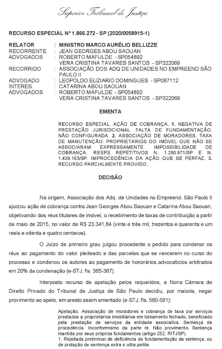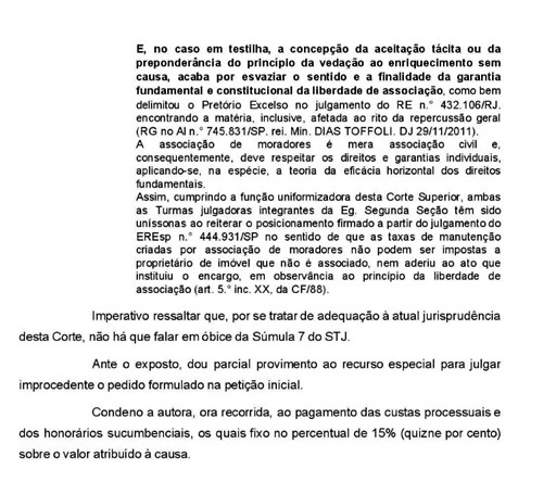 Para melhor ilustrar essa excelente vitoria contra a associação solicitamos ao nosso especialista que recursou ao STJ sendo que ao final o Direito do Morador foi reconhecido. Por ser o processo publico não estar sobre segredo de Justiça tommaos liberdade de repoduzir parcialmente o julgado.