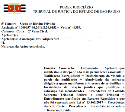 Neste caso em especial, o Desembargador foi indevidamente processado e condenado porém lá estava o especialista para assistir a mais essa vítima contra mais uma ação absurda, abusiva e antijurídica culminando com uma sentença condenatória oriunda de uma ação de cobrança promovida por uma associação "que já foi condenada dezenas de vezes" por essa pratica funesta, mas mesmo sabendo que muitas decisões desse Juízo foram reformadas pois a sentença estava contrária ao entendimento da jurisprudência uníssona e do tema da 2º Turma do STJ mesmo assim as decisões condenatória se sucedem sem qualquer cerimônia, mas o Tribunal de justiça de São Paulo analisando o Recurso promovido pelo especialista reformou totalmente a sentença e condenou a associação (mais uma vez) em face de uma sentença condenatória que foge totalmente ao entendimento do ordenamento jurídico pátrio, assim mais um caso que teve um desfecho favorável para mais uma vitima dos falsos condomínios.