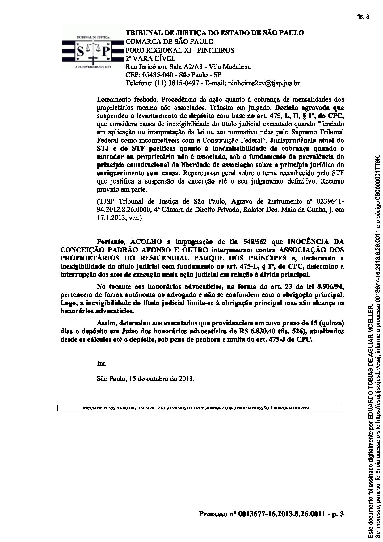 Após varias vitórias expressivas, conseguimos anular um titulo Judicial (sentença) perante a Vara de Pinheiros, onde o magistrado mediante o trabalho juridico realizado reconheceu que a sentença por ele decretada estava realmente em desacordo com a jurisprudência e era inconstitucional, assim declarou a inexigibilidade do titulo judicial para outro morador local. (Fato Inédito no Judiciário).